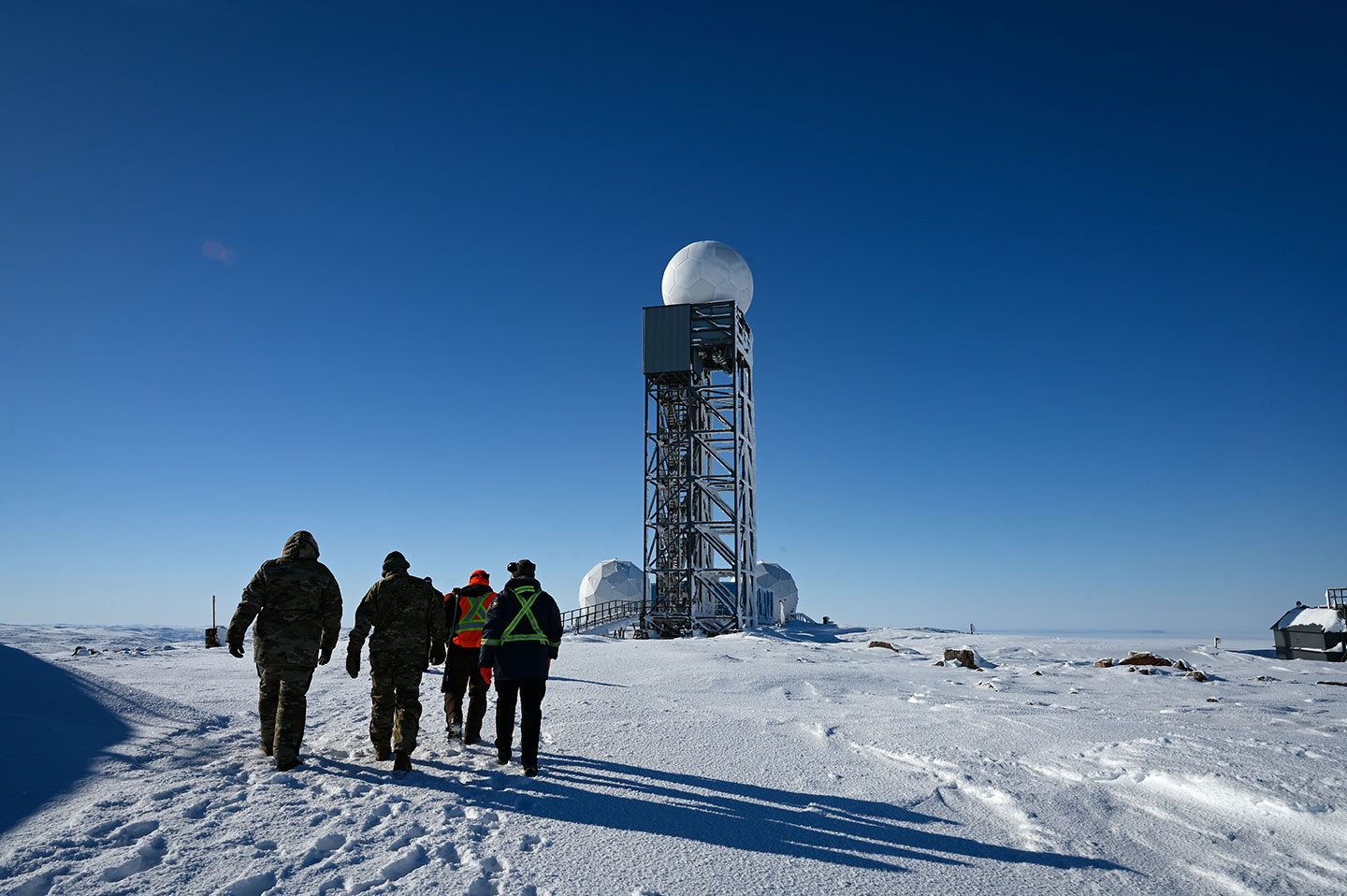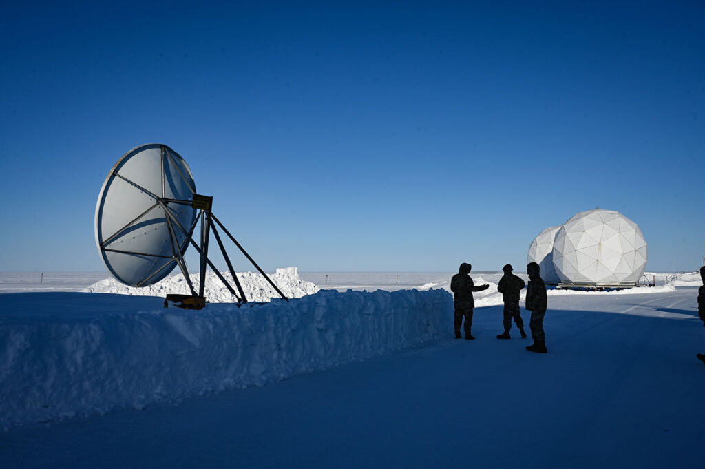 U.S. Air Force (USAF) Air Combat Command Acquisition Management and Integration Center Detachment 1 team members and other USAF personnel walk around the North Warning System Site FOX-M Hall Beach, Sanirajak, Nunavut, Canada, on April 9, 2025. Canada plans to build the Enhanced Satellite Communications Project – Polar to expand its Arctic communications capabilities. STAFF SGT. MADELINE HERZOG/U.S. AIR FORCE
