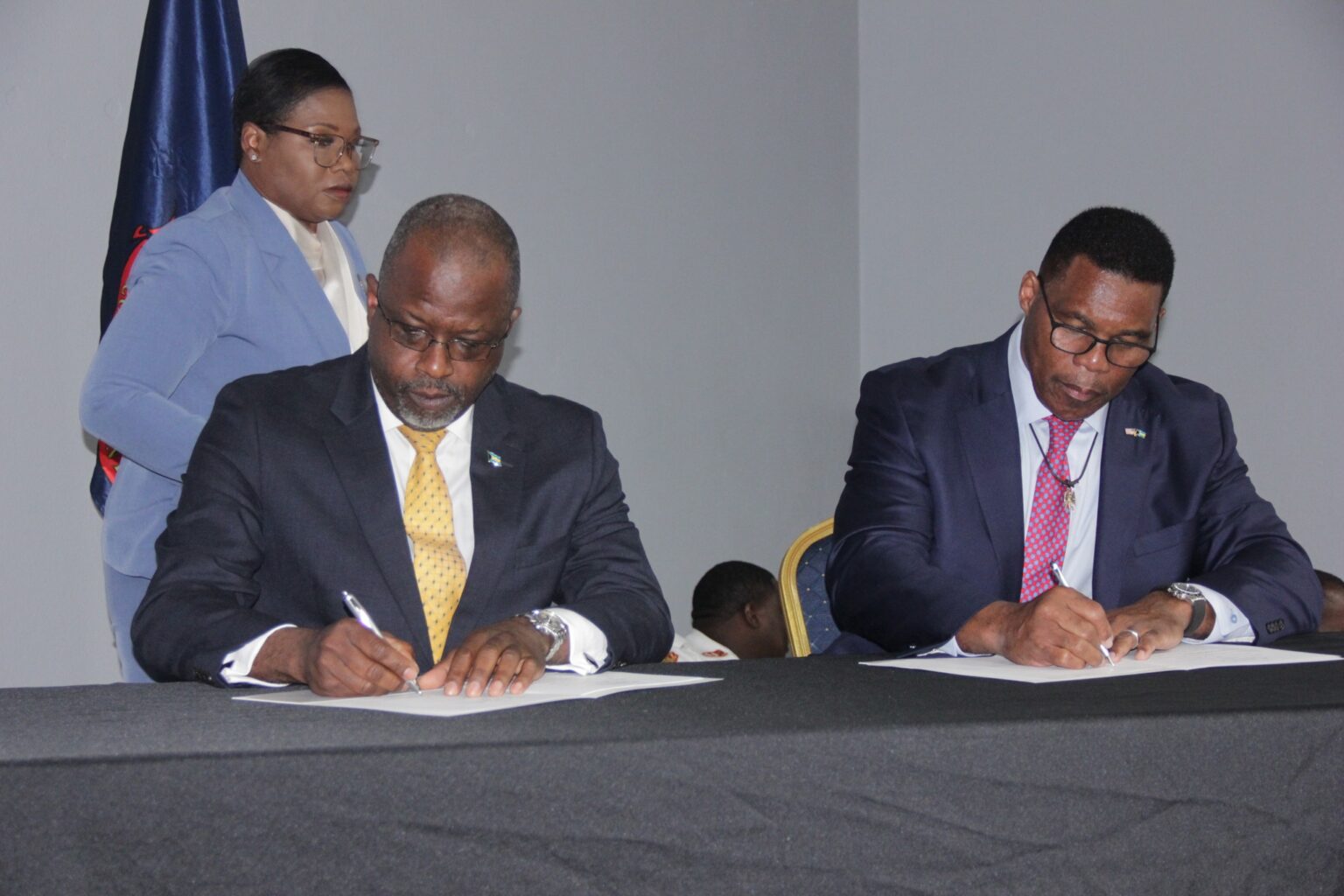 Bahamas Minister of National Security Wayne Munroe, left, and U.S. Ambassador Herschel Walker sign documents at the commissioning ceremony for a drug incinerator, six SAFE boat lifts and two scanners on February 23, 2026, at the Royal Bahamas Police Force Headquarters in Nassau, The Bahamas. BAHAMAS MINISTRY OF NATIONAL SECURITY